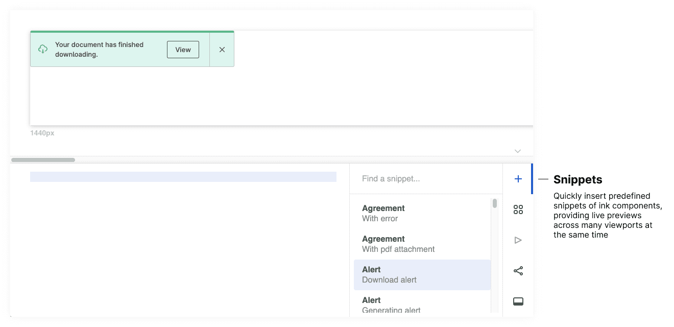 Snippets are like templates for our ink components. Most examples we provide in our component documentation are available as a snippet in Playroom so our designers and engineers have a seamless transition.