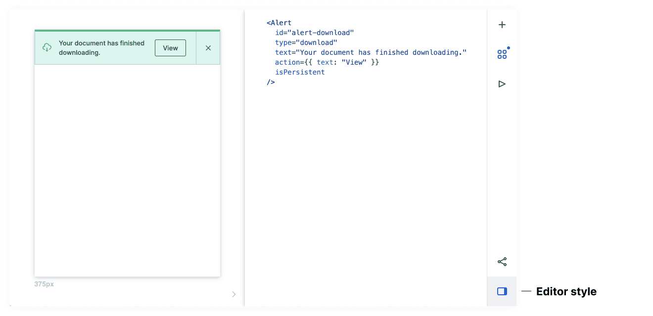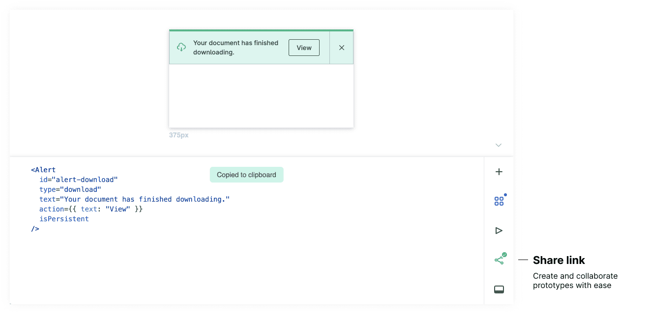 As we add code to playroom, the URL is automatically encoding a Base64-encoded ASCII string which is immediately shareable. Any modifications will generate a new encoded link which shares the modified code. This allows us to copy and share the exact state of a design with our colleagues through slack, email, etc.