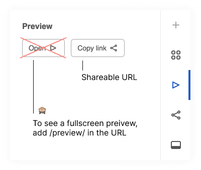 To get a fullscreen preview of the playroom mock, we have to manually insert /preview/index.html in the shareable URL (for now).