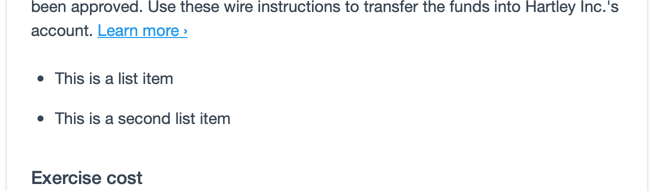 ⚠️ This section is out of date! The default list style is more condensed than as pictured. There is no spacing between list items in production. Use class "header-list" on the "ul" or "ol" element to add a space below each list item. This should only be used in the case where you are providing headers inside your list items.